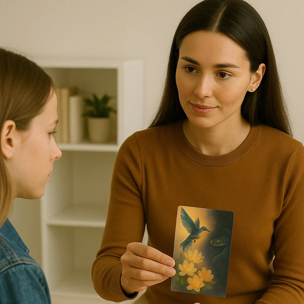 1. Mundo Interno: Abordan los paisajes emocionales invisibles que muchas veces no logran expresarse verbalmente. Las cartas invitan al adolescente a poner en palabras o imágenes aquello que lo habita por dentro: emociones confusas, sensaciones difíciles de nombrar, tensiones internas. Es un punto de partida para la validación emocional y la exploración profunda del mundo interno.